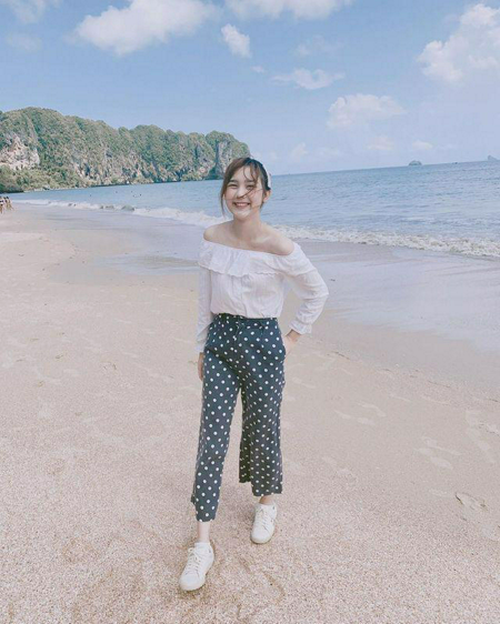 มากันที่สไตล์การแต่งตัวกันบ้าง แมทช์เสื้อเปิดไหล่แขนยาวสีขาว กับกางเกงขายาวลายจุด ใส่รองเท้าผ้าใบสีขาวก็ลงตัว