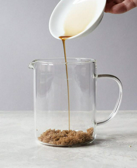 5. ใส่น้ำตาลทรายแดงกับวานิลลาสกัดลงในภาชนะอีกใบ