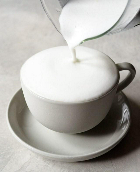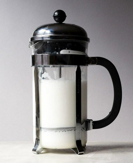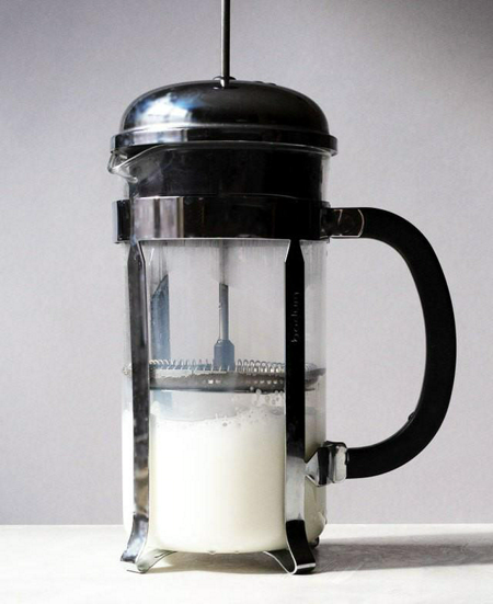 4. กดตัวปั๊มไปเรื่อยๆ จนนมฟูขึ้นเป็นฟอง ( ถ้าไม่มีเครื่องจริงๆ ก็ไม่เป็นไรค่ะ ยังมีอีกหลายวิธีที่ใช้แทนกันได้ เช่น ใช้เครื่องตีฟองนม ปั่นด้วยเครื่องปั่น หรือแม้กระทั่งใส่ขวดโหลที่มีฝาปิดมิดชิดและออกแรงเขย่า ฯลฯ )